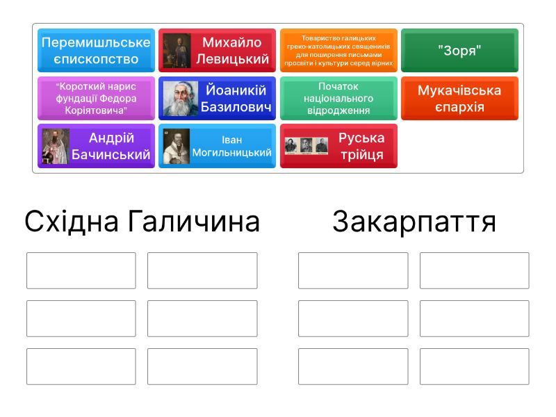 Східна Галичина: Руська трійця, Товариство галицьких греко-католицьких священиків для поширення письмами просвіти і культури серед вірних, Перемишльське єпископство, Михайло Левицький, Іван Могильницький, "Зоря", Закарпаття: Йоаникій Базилович, Андрій Бачинський, Початок національного відродження, Мукачівська єпархія, “Короткий нарис фундації Федора Коріятовича”,