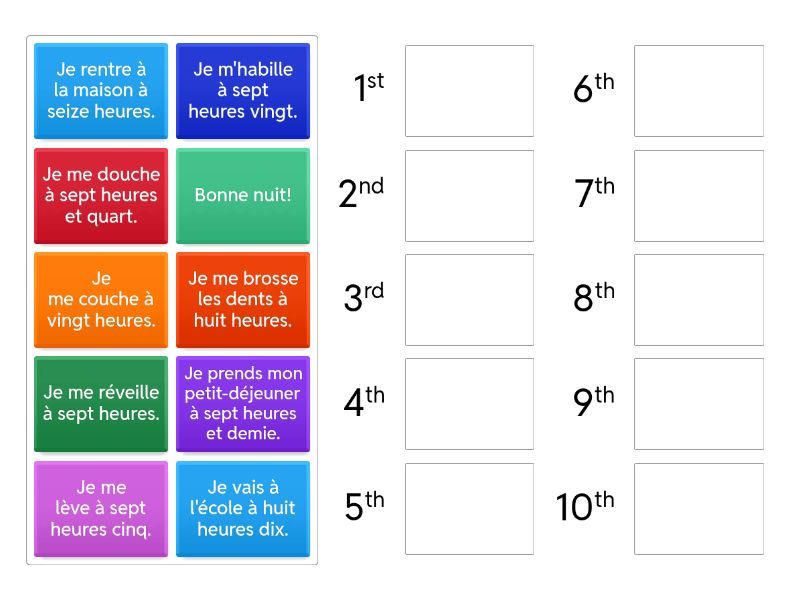 Je me réveille à sept heures., Je me lève à sept heures cinq., Je me douche à sept heures et quart., Je m'habille à sept heures vingt., Je prends mon petit-déjeuner à sept heures et demie., Je me brosse les dents à huit heures., Je vais à l'école à huit heures dix., Je rentre à la maison à seize heures., Je me couche à vingt heures., Bonne nuit!.