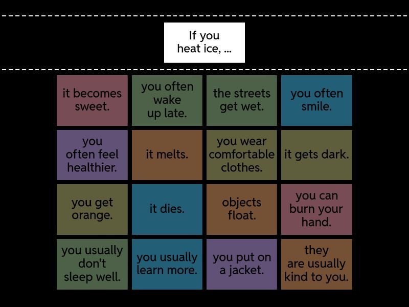it melts. - If you heat ice, ..., the streets get wet. - If it rains, ..., it dies. - If you don't water a plant, ..., you get orange. - If you mix red and yellow, ..., you can burn your hand. - If you touch fire, ..., you often feel healthier. - If you exercise regularly, ..., objects float. - If there is no gravity, ..., you usually don't sleep well. - If you drink coffee before bed, ..., you usually learn more. - If you study hard, ..., it gets dark. - If the sun goes down, ..., it becomes sweet. - If you add sugar to coffee, ..., you put on a jacket. - If you feel cold, ..., they are usually kind to you. - If you are kind to people, ..., you often wake up late. - If you don't set an alarm, ..., you often smile. - If you feel happy, ..., you wear comfortable clothes. - If you work from home, ...,