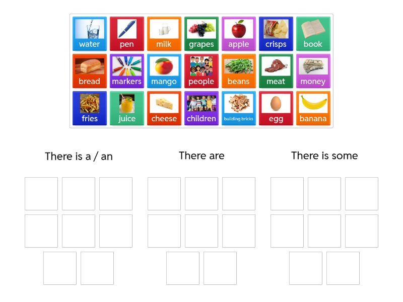 There is a / an: apple, banana, egg, mango, book, pen, There are : building bricks, markers, fries, grapes, beans, crisps, children, people, There is some: water, cheese, juice, milk, bread, meat, money,