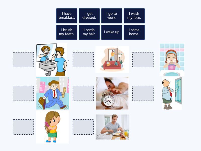 I wake up, I have breakfast., I get dressed., I brush my teeth. - ., I go to work., I comb my hair., I come home., I wash my face.,
