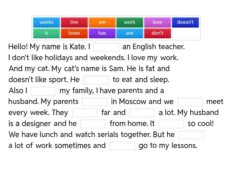 Hello! My name is Kate. I ____ an English teacher. I don't like holidays and weekends. I love my work. And my cat. My cat's name is Sam. He is fat and doesn't like sport. He ____ to eat and sleep. Also I ____ my family, I have parents and a husband. My parents ____ in Moscow and we ____ meet every week. They ____ far and ____ a lot. My husband is a designer and he ____ from home. It ____ so cool! We have lunch and watch serials together. But he ____ a lot of work sometimes and ____ go to my lessons.