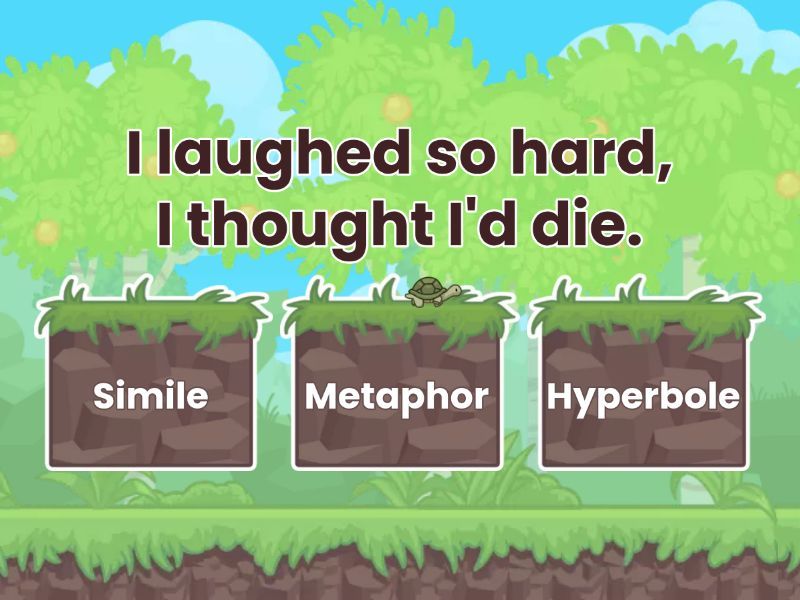 1) I laughed so hard, I thought I'd die. a) Simile b) Metaphor c) Hyperbole 2) That dog is the size of a horse! a) Simile b) Metaphor c) Hyperbole 3) Everyone knows Mark is a total couch potato. a) Simile b) Metaphor c) Hyperbole 4) Imani has a mind like a steel trap. a) Simile b) Metaphor c) Hyperbole 5) In Korea, there are mosquitos the size of birds. a) Simile b) Metaphor c) Hyperbole 6) Our new co-worker is a breath of fresh air. a) Simile b) Metaphor c) Hyperbole 7) It took me about a hundred years to cook this turkey. a) Simile b) Metaphor c) Hyperbole 8) Portia's new gown fits like a glove. a) Simile b) Metaphor c) Hyperbole 9) We've been waiting in line forever. a) Simile b) Metaphor c) Hyperbole 10) This assignment is a piece of cake!  a) Simile b) Metaphor c) Hyperbole 11) After everything I ate, I feel as sick as a dog. a) Simile b) Metaphor c) Hyperbole 12) Camilla is as sweet as pie. a) Simile b) Metaphor c) Hyperbole 13) Yun came to work with a broken leg. She's a real tough cookie. a) Simile b) Metaphor c) Hyperbole 14) Charles owns a million pairs of shoes.  a) Simile b) Metaphor c) Hyperbole 15) I don't know what you're complaining about - the test was a breeze. a) Simile b) Metaphor c) Hyperbole 16) Lou spent all his money on his new truck, and now he's in a serious pickle.  a) Simile b) Metaphor c) Hyperbole 17) Laila's feeling under the weather today, so she won't be coming to class. a) Simile b) Metaphor c) Hyperbole 18) Diing's new baby is as cute as a button. a) Simile b) Metaphor c) Hyperbole