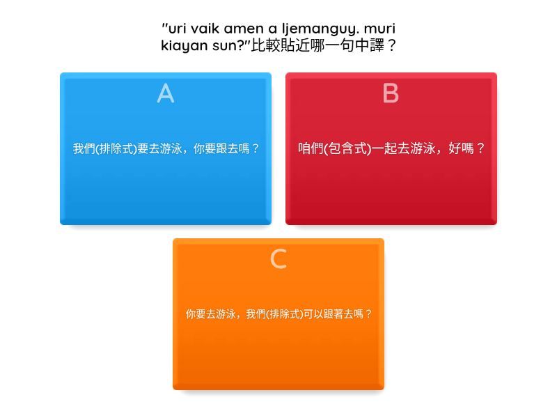 1) "uri vaik amen a ljemanguy. muri kiayan sun?"比較貼近哪一句中譯? a) 咱們(包含式)一起去游泳,好嗎? b) 我們(排除式)要去游泳,你要跟去嗎? c) 你要去游泳,我們(排除式)可以跟著去嗎? 2) "uri vaik amen a ljemanguy. muri kiayan sun?"這一句裡的"amen",是什麼的性質的人稱代名詞呢? a) 後依附,排除式 b) 前依附,排除式 c) 後依附,包含式 3) "uri mirava itjen tua kabang/ljavac."比較貼近哪一句中譯? a) 咱們(包含式)準備了書包 b) 咱們(包含式)將要準備書包。 c) 我們(排除式)準備了書包 4) "uri mirava itjen tua kabang/ljavac."這一句裡的"itjen",是什麼的性質的人稱代名詞呢? a) 後依附,排除式 b) 前依附,排除式 c) 後依附,包含式 5) "tjaljava’ilan/tjaljaparavacan aken tua situ i gakku."比較貼近哪一句中譯? a) 你是學校裡最就頑皮的學生。 b) 我是學校裡最就頑皮的學生。 c) 我們是學校裡最就頑皮的學生。 6) "tjaljava’ilan/tjaljaparavacan aken tua situ i gakku."這一句裡的"aken",是什麼的性質的人稱代名詞呢? a) 後依附 b) 前依附 c) 自由;中性 7) "tjaljaca'uan/tjaljacaquan tua cinunan mun i ’inaljan/qinaljan."比較貼近哪一句中譯? a) 我們(排除式)是部落裡最厲害的獵人。 b) 你們是部落裡最厲害的獵人。 c) 他們是部落裡最厲害的獵人。 8) "tjaljaca'uan/tjaljacaquan tua cinunan mun i ’inaljan/qinaljan."這一句裡的"mun",是什麼的性質的人稱代名詞呢? a) 後依附 b) 前依附 c) 自由;中性 9) 有族人問起 "nima aicu a tavatavangen a dingwa?" 要怎麼回答才適當? a) tiaken. b) niaken. c) tjnuaken. 10) 有族人問起 "inuan a nu kaizuanan?" 怎麼回答才適當? a) i taihuku a nia kaizuanan. b) i taihuku a tja kaizuanan. c) i taihuku a nu kaizuanan. 11) 有同班同學問起 " uri kitulu nutaiv/nutiaw?" 怎麼回答才適當? a) ui, uri su tuluin nutaiv/nutiaw. b) ini, inika tjen a kitulu nutiav/nutiaw. c) nakitulu aken. d) ari, vaiki a kitulu. 12) 同伴問你問題 " kemuda nu sekaulaw/sekaulav itjen? "怎麼回答才適當? a) kivadaq/kivada' timadju tua kisacu. b) kivadaq/kivada' mun tua kisacu. c) tja kivadaqaw/kivada'aw ta kisacu kaumaya.