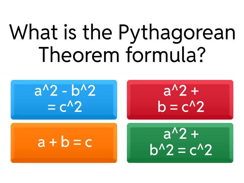 1) What is the Pythagorean Theorem formula? a) a^2 - b^2 = c^2 b) a^2 + b = c^2 c) a + b = c d) a^2 + b^2 = c^2 2) In a right triangle, if a = 3 and b = 4, what is c? a) 5 b) 6 c) 8 d) 7 3) What is the distance formula derived from the Pythagorean Theorem? a) (x2-x1) + (y2-y1) b) x2^2 + y2^2 c) x1 + y1 = x2 + y2 d) √((x2-x1)^2 + (y2-y1)^2) 4) If the coordinates of a point are (3, 4), what is its distance from the origin? a) 7 b) 6 c) 5 d) 4 5) What is the hypotenuse of a triangle with legs 6 and 8? a) 12 b) 11 c) 9 d) 10 6) Which point lies on the line y = x? a) (2, 2) b) (1, 3) c) (3, 4) d) (0, 2) 7) What is the length of the diagonal of a square with side 5? a) 10 b) 5 c) 5√2 d) 7 8) Find the distance between (1, 2) and (4, 6). a) 5 b) 6 c) 4 d) 7 9) If a triangle has sides 9, 12, what is the hypotenuse? a) 14 b) 13 c) 15 d) 18 10) What is the midpoint of (2, 3) and (4, 7)? a) (2, 6) b) (3, 4) c) (3, 5) d) (4, 5) 11) Which is a Pythagorean triple? a) 2, 3, 4 b) 3, 4, 5 c) 7, 8, 9 d) 5, 6, 7 12) What is the slope of the line through (1, 2) and (3, 6)? a) 1 b) 4 c) 2 d) 3 13) Find the length of the hypotenuse if the legs are 5 and 12. a) 16 b) 13 c) 15 d) 14 14) What is the area of a triangle with base 6 and height 8? a) 48 b) 36 c) 30 d) 24 15) If a = 8 and b = 15, what is c? a) 17 b) 18 c) 19 d) 16 16) What is the distance between (0, 0) and (5, 12)? a) 16 b) 14 c) 13 d) 15 17) Find the hypotenuse of a triangle with legs 7 and 24. a) 25 b) 27 c) 26 d) 28 18) What is the length of the diagonal of a rectangle with sides 3 and 4? a) 8 b) 7 c) 6 d) 5 19) If the coordinates of a point are (6, 8), what is its distance from the origin? a) 12 b) 9 c) 10 d) 11 20) What is the hypotenuse of a triangle with legs 9 and 40? a) 42 b) 41 c) 44 d) 43