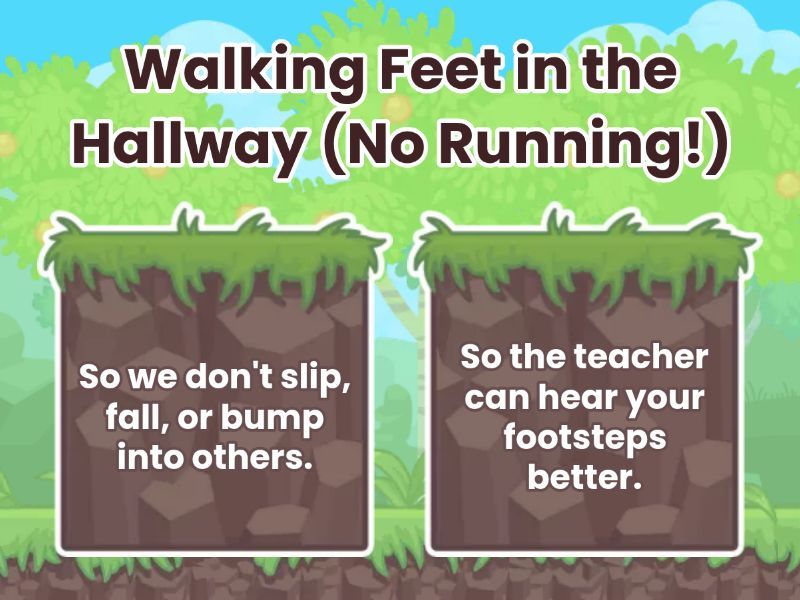 1) Walking Feet in the Hallway (No Running!) a) So we don't slip, fall, or bump into others. b) So the teacher can hear your footsteps better. 2) Raise your Hand before speaking. a) To stretch your arm and wake up your body. b) So everyone gets a fair turn to share their ideas, and no one interrupts. 3) Keeping your Hands to Yourself. a) To keep everyone safe and feeling comfortable in their personal space. b) To help you remember where your body is standing. 4) Share the Materials with friends. a) To see who can hold the materials the longest. b) So every friend gets a chance to use the crayons, blocks, or balls. 5) Listen When Others Speak (Eyes on the Speaker). a) Because if you listen, you don't have to talk yourself. b) To understand all the instructions and show that we value their words. 6) Wait Patiently in Line without pushing or talking. a) To avoid pushing, keep the line moving smoothly, and respect time. b) To see how long you can stand without needing to sit down. 7) Say 'Please' and 'Thank You'. a) So your mouth gets practice making happy sounds. b) To show good manners and kindness to the people helping us. 8) Push your chair under your desk when you stand up. a) To give the chairs a good rest and help them nap. b) So no one trips or bumps into them when walking around the room.