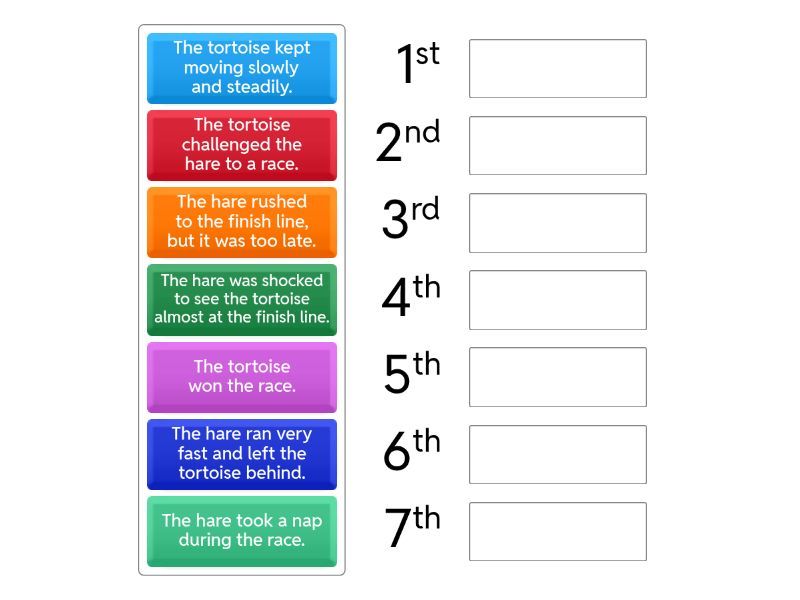 The tortoise challenged the hare to a race., The hare ran very fast and left the tortoise behind., The hare took a nap during the race., The tortoise kept moving slowly and steadily., The hare was shocked to see the tortoise almost at the finish line., The hare rushed to the finish line, but it was too late., The tortoise won the race..