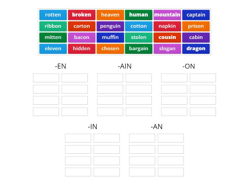 -EN: broken, eleven, hidden, heaven, chosen, stolen, mitten, rotten, -AIN: mountain, captain, bargain, -ON: dragon, cotton, carton, ribbon, prison, bacon, -IN: cousin, cabin, napkin, penguin, muffin, -AN: human, slogan,