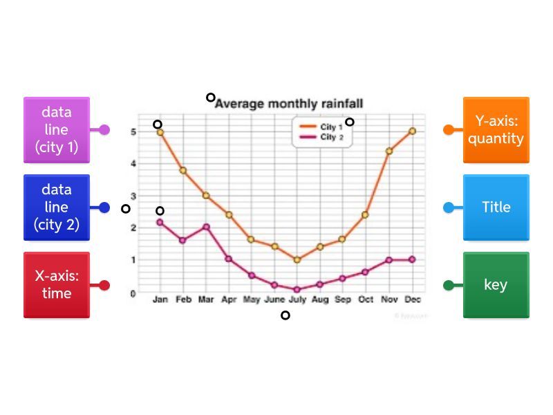 Title, X-axis: time, Y-axis: quantity, key, data line (city 1), data line (city 2).