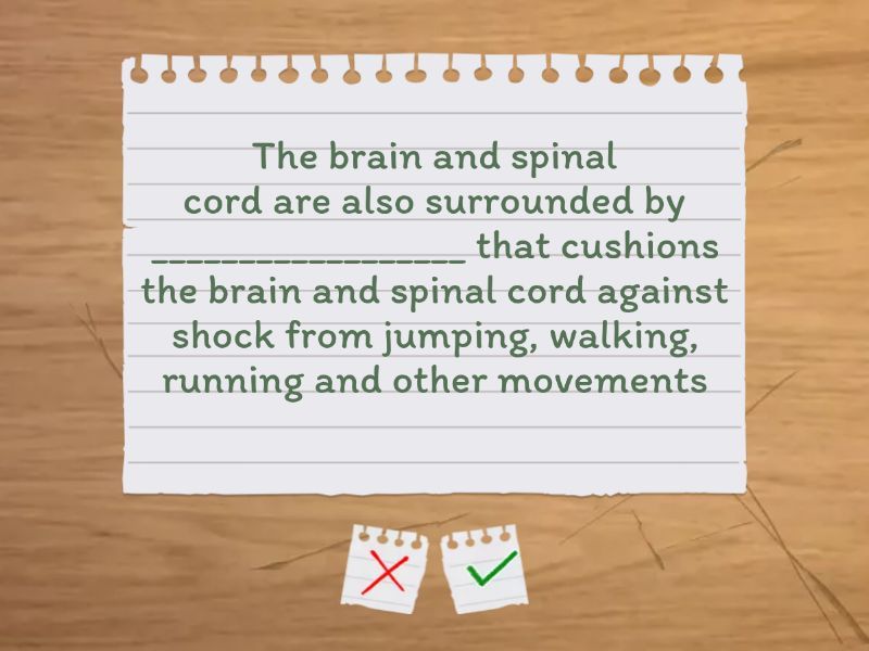 This control center of the body - The Nervous System, This Controls, monitors and coordinates all body parts and processes - The Nervous System, This also receives information from the environment and makes specific body parts act on that information - The Nervous System, The Nervous System is made of ___________, _____________, ________________- - brain, spinal cord and nerves, The nervous system is divided into how many parts - 2 parts, What are the 2 main parts of the Nervous System - Central Nervous System (CNS) and Peripheral Nervous System (PNS), The centra Nervous System is composed of _____________ and ______________ - brain and spinal cord, The Peripheral Nervous System (PNS) is consists of________________ - Nerves, This consists of the brain and spinal cord - Central Nervous System, This controls all the activities of the body - Central Nervous System, Draw the Central Nervous System, This serves as the "central station" of our nervous system - Brain, It is the primary organ of the central nervous system contained in a skull - Brain, How heavy is the brain - 1.25 kg, This weighs about 1.25 kg and has a whitish pink appearance with a wrinkled surface - Brain, True or False. The human brain is made up of more than 100 billion nerve cells or neurons - True, True or False. Each neuron is connected to as many as 25,000 other neurons - True, These carry nerve impulses or electrical signals - Nerve cells or Neurons, A nerve impulse is a ___________ that moves rapidly from one end of a neuron to another - message, The brains has how many layers of protective covering? - 3 layers, What are the 3 layers of the brain - 1. outer layer (dura mater) 2. middle layer (arachnoid) 3. The inner layer (pia mater), The brains has three layers of protective covering called _______________ - meninges, This is the skull's inner surface. It forms partitions in the skull that prevent excessive brain movement - outermost layer (dura mater), This is the layer of the brain that supplies the brain with nutrients and oxygen and cushions it from shock - middle layer (arachnoid), This is one of the layer of the brain that acts as a wall that prevents bacteria from reaching the brain - inner layer (pia mater), The brain and spinal cord are also surrounded by __________________ that cushions the brain and spinal cord against shock from jumping, walking, running and other movements - cerebrospinal fluid, True or False. The Brain is made of hemisphere - True, The brain is made up of 2 hemisphere. What are these? - Left Hemisphere and Right Hemisphere, These are connected by nerves that form a structure called corpus callosum - hemisphere, In the hemisphere, the connected by nerves that form a structure is called __________________ - corpus callosum, The right hemisphere controls the ______________ side of the body - left side, The left hemisphere controls the __________ side of the body - right side, What are the 3 Major Parts of the Brain - 1. Cerebrum 2. Cerebellum 3. Brain Stem, This part of the brain has the largest structure in the brain - cerebrum, This part of the brain is responsible for speech, memory, emotions, intelligence, reasoning, thinking, sensation - Cerebrum, This controls higher brain functions and deep grooves separate each hemisphere into 4 lobes, each with different functions - Cerebrum, What are the 4 lobes of cerebrum - 1. frontal lobe 2. Parietal Lobe 3. Occipital Lobe 4. Temporal Lobe, This is one of the lobe that responsible for executive function, decisions, personality, language, planning, movement - frontal lobe, This lobe is responsible for intelligence, reasoning, sensation, reading - Parietal lobe, This lobe is responsible for vision or sight - occipital lobe, This lobe is responsible for language, behavior, hearing, vision, emotions and memory - temporal lobe, The higher folded outer layer of the cerebrum is called ___________ - cerebral cortex, True or False. The folds, or convolutions, maximize the surface area of the brain within the limits imposed by the cranium, or skull. These folds increase the ability of the brain to store information - True, This is one of the major part that has second largest part of the brain - cerebellum, This s also known as the "little brain" - Cerebellum, This part of the brain specifically responsible for balance, posture and motor coordination - cerebellum, This part of the brain regulates the muscles as they contract and relax - cerebellum, If the cerebellum is damaged, a person maybe ____________. He or she may not be able to move his or her arms and legs - paralyzed, This is the smallest part of the brain - brain stem, This part of the brain is located at the base of the skull, just below the cerebellum - brain stem, This connects the brain and the spinal cord - brain stem, This part of the brain controls the basic life functions such as heartbeat, breathing, and digestion - brain stem, True or False. The Brain Stem has 3 parts. - True, What are the 3 parts of the Brain stem - 1. midbrain 2. pons 3. medulla oblongata , This is part of the brain stem that brings messages to the cerebrum from the sense organs - midbrain, This part of the brain stem that is responsible for eye reflexes - Midbrain, This is part of the brain stem that helps regulate sleep - Midbrain, This is part of the brain stem that is located at the upper portions of the brain stem, receives stimuli from facial areas - pons, This part of the brain stem that is in the lower portion of the brain stem - Medulla Oblongata, This is the part of the brain stem that controls the activity of the internal organs - Medulla Oblongata, This is the part of the brain stem that controls breathing, heartbeat, muscular actions of digestive organs, glandular secretions, and other subconscious activities - Medulla Oblongata,