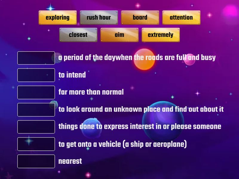 board - to get onto a vehicle (a ship or aeroplane), closest - nearest, exploring - to look around an unknown place and find out about it, rush hour - a period of the daywhen the roads are full and busy, aim - to intend, attention - things done to express interest in or please someone, extremely - far more than normal,