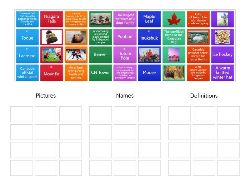 Pictures: , , , , , , , , , , , , Names: Maple Leaf, CN Tower, Niagara Falls, Totem Pole, Beaver, Moose, Ice hockey, Poutine, Toque , Mountie, Lacrosse, Inukshuk, Definitions: The unofficial name of the Canadian flag., A 553.3 m-high communications and observation building in downtown Toronto., The waterfalls that cross the border between Canada and the USA, A tall carved wooden pole made by Indigenous Peoples, An animal with strong teeth and flat tail., The largest member of a deer family, Canada's official winter sport, A dish of French fries with cheese curds and gravy, A warm knitted winter hat, Canada's national police, known for red uniforms, A sport using a stick and a ball, created by Indigenous people, A stone landmark built by Indigenous people for navigation and communication,