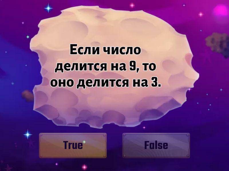 True: Если число делится на 9, то оно делится на 3., Число, оканчивающееся на 0, делится на 2, 5 и 10., Если два числа делятся на 3, то их сумма тоже делится на 3., False: Число 81 делится на 6, потому что делится на 3., Если число делится на 5, то оно обязательно оканчивается на 0., 2 и 4 делятся на 2, поэтому их сумма делится на 4.,