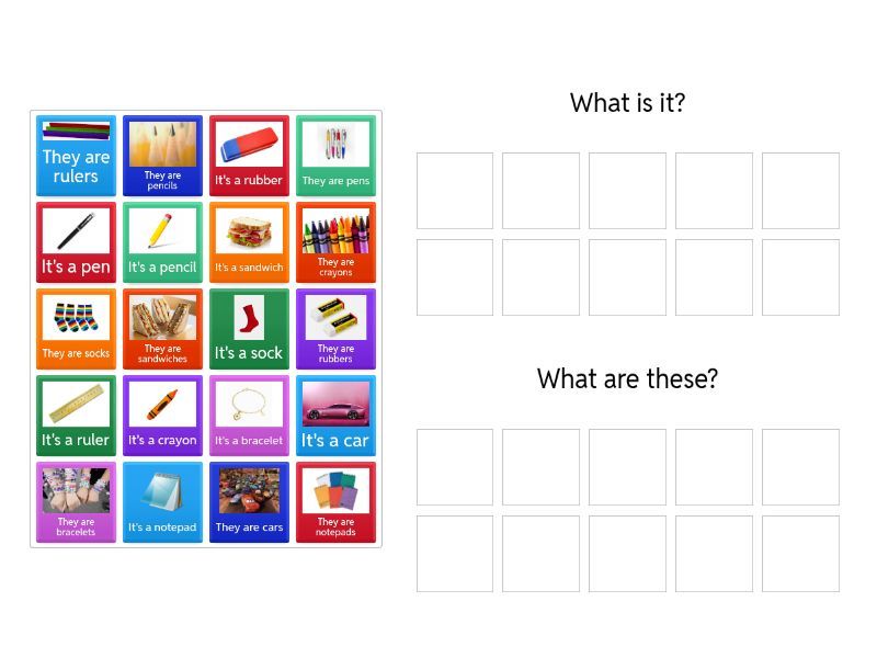What is it?: It's a pen, It's a ruler, It's a rubber, It's a crayon, It's a pencil, It's a notepad, It's a car, It's a sock, It's a bracelet, It's a sandwich, What are these?: They are pens, They are rulers, They are rubbers, They are crayons, They are pencils, They are notepads, They are cars, They are socks, They are bracelets, They are sandwiches,