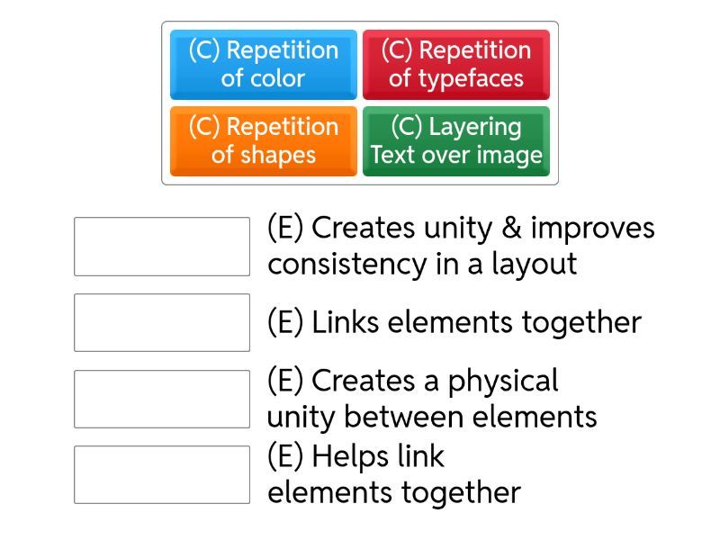 (C) Repetition of color - (E) Links elements together, (C) Repetition of shapes - (E) Helps link elements together, (C) Repetition of typefaces - (E) Creates unity & improves consistency in a layout, (C) Layering Text over image  - (E) Creates a physical unity between elements,