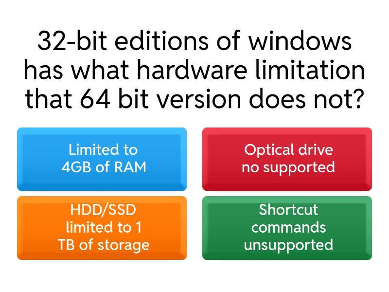 1) 32-bit editions of windows has what hardware limitation that 64 bit version does not? a) Limited to 4GB of RAM b) Optical drive no supported c) HDD/SSD limited to 1 TB of storage d) Shortcut commands unsupported 2) Windows 11 introduced what task-bar change, compared to previous versions? a) Widgets on taskbar b) Mobile app mirroring capabilities on taskbar c) SnackBar TaskBar FactBar application programming interface d) center-aligned taskbar 3) Windows Home lacks what notable feature compared to other editions? a) The ability to rent windows home and not own windows home b) Ability to join a Window's Domain Network c) Microsoft Edge Browser d) Customizeable taskbar 4) Windows Home offers two licensing models. What are they? a) OEM License b) Leased / Short term business license c) Government/ Clearance License d) Retail License 5) True/False A computer running windows 10 Home can upgrade/update directly to Windows 11 Enterprise. a) True, because windows product's updates are all compatible once purchased b) False, they need subscription key that only Microsoft gives to businesses. c) False, because Windows Enterprise requires volume licensing, that home edition does not support. d) True, you just need to download from Microsoft app store. 6) A Multiboot computer refers to what? a) Multiple / simultaneous app boot up capabilties b) Computer used by multiple accounts c) Multiple footnotes in the system's log files d) A computer that has More than one OS installed on a single computer. 7) When installing an OS, it must be installed on a partition with a compatible file system. Windows uses NTFS, Mac OS uses what what filing system? a) FPS120 b) AFPS c) APFS d) Ext4 8) Precious takes her computer in for repair at Yovin's PC shop "Yovin ByteSmith protocol". Precioius wants to keep her settings and personal files intact but needs a system reinstall. What would Yovin do for this case? a) Hard Reset b) Full Reset c) Refresh Install d) Docu-Safe Install 9) Emily is new to the org and we're getting her laptop configured. To speed things up were going to configure her laptop via the network what is the name of this protocol/progam we're using for setup?  a) CloneZilla(Copy Software) b) PXE (Preboot Execution Environment) c) Master-Splinter(Data Tunnel configuration software) d) Hedgehog_Sonic.Exe (Gotta Go Fast- enterprise software)