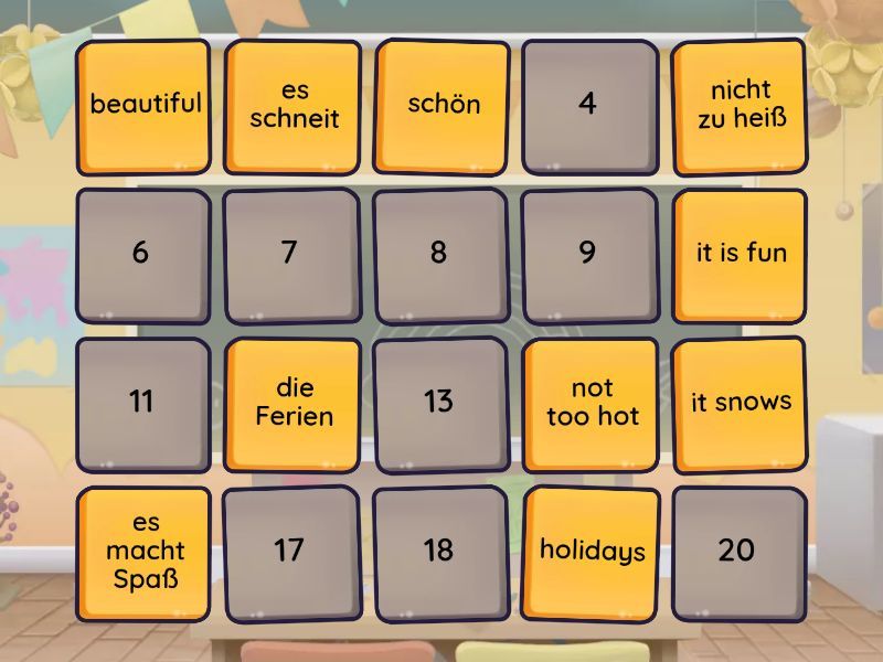 die Ferien - holidays, schön - beautiful, nicht zu heiß - not too hot, es schneit - it snows, es macht Spaß - it is fun, am Strand - on the beach, spielen - to play, nur Sonne! - only sun!, weg - away, acht Stunden - eight hours,