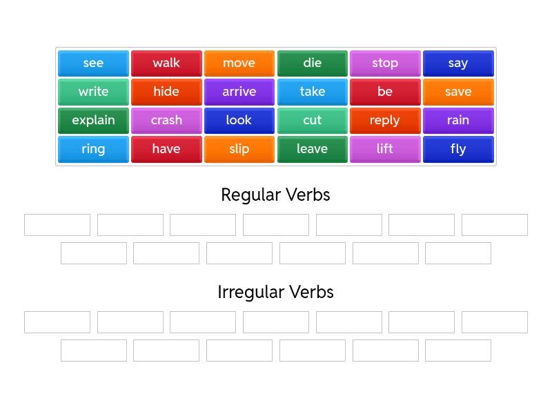 Regular Verbs: die, stop, rain, reply, walk, explain, arrive, crash, move, slip, save, look, lift, Irregular Verbs: say, see, ring, take, leave, be, hide, write, have, fly, cut,