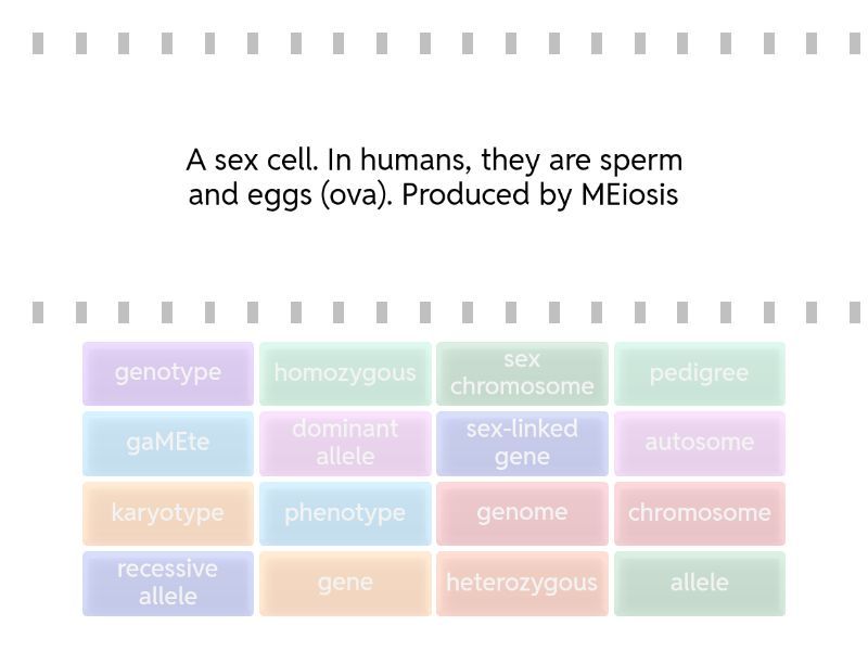 gaMEte - A sex cell. In humans, they are sperm and eggs (ova). Produced by MEiosis, chromosome - Contained inside the cell's nucleus. These are long threads of DNA, which are made up of many genes., gene - A small section of DNA on a chromosome, that codes for a particular sequence of amino acids, to make a specific protein. It is the unit of heredity, and may be copied and passed on to the next generation., allele - Different versions of the same gene are called...., dominant allele - Always expressed, even if only one copy is present. Represented by a capital letter, for example, A., recessive allele - Only expressed if the individual has two copies and does not have the dominant allele of that gene. Represented by a lower case letter, for example, a., homozygous - Same two alleles for example AA or aa, heterozygous - Two different alleles for the same characteristic, for example Aa., genotype - The collection of alleles that determine characteristics, phenotype - Expression of the genotype., genome - All the genetic material (DNA) in an organism., karyotype - A picture or diagram showing all the chromosomes in a cell, arranged in pairs., sex chromosome - A chromosome that determines biological sex (X and Y chromosomes)., autosome - Any chromosome that is not a sex chromosome., sex-linked gene - A gene located on a sex chromosome (usually on the X chromosome)., pedigree - A family tree diagram that shows how traits or genetic conditions are inherited.,