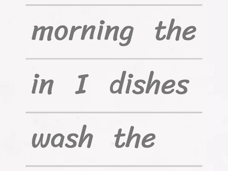 I wash the dishes in the morning, she takes a shower in the evening, my mum studies my room every day, we come home at 5 o'clock, I watch TV in the evening, he brushes his teeth every morning, I do housework on Sunday, you get up at 6 o'clock, my sister has breakfast in the , we have dinner in the evening,