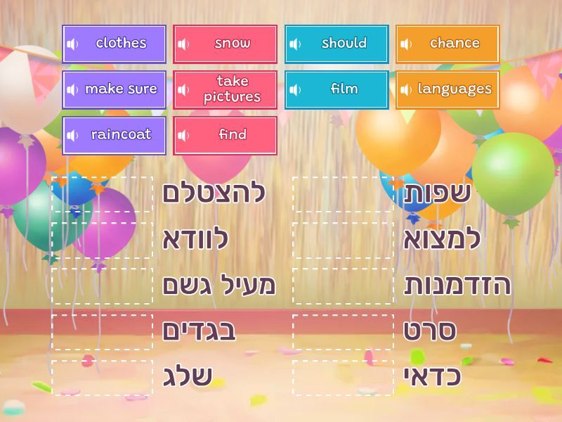act - לשחק(בסרט), best wishes - מיטב האיחולים, can't wait - לא יכול לחכות, dear - יקר, draw - לצייר, find - למצוא, the same - אותו הדבר, well - היטב, languages - שפות, take pictures - להצטלם, take walks - לטייל ברגל, film - סרט, chance - הזדמנות, clothes - בגדים, make sure - לוודא, pack - לארוז, raincoat - מעיל גשם, should - כדאי, snow - שלג, what else - מה עוד,