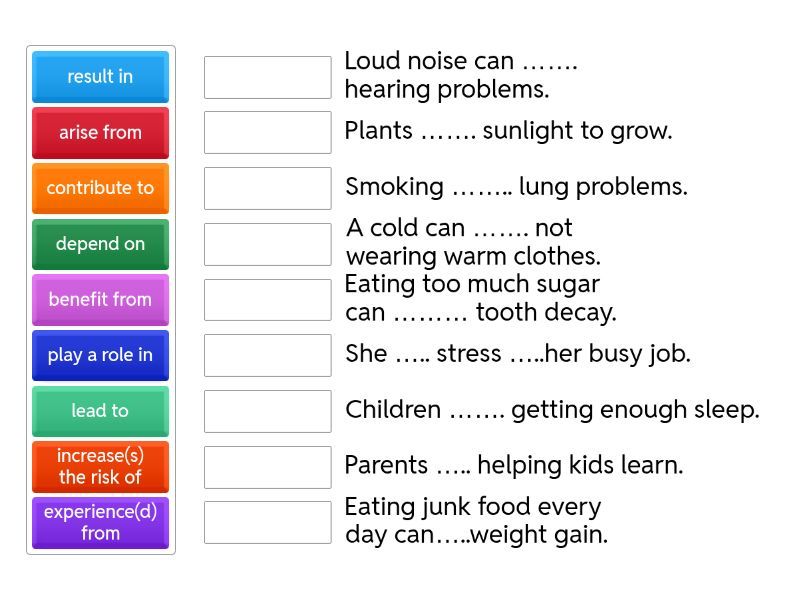 account for - The rain may ….. the wet roads., arise from - A cold can ……. not wearing warm clothes., result in - Eating too much sugar can ……… tooth decay., participate in - Many students ……. school sports., increase(s) the risk of - Smoking …….. lung problems., benefit from - Children ……. getting enough sleep., contribute to - Loud noise can ……. hearing problems., depend on - Plants ……. sunlight to grow., relocate(d) from - The family …… the city to the country., experience(d) from - She ….. stress …..her busy job., engage(d) in - The children ……. a fun art activity., have/has an impact on - Exercise …… health., provide(d) support for - The teacher …. the new student., present barriers to - Not speaking English well can ….. finding a job., lead to - Eating junk food every day can…..weight gain., increase(s) exposure to - Staying in the sun too long ….. sunburn., play a role in - Parents ….. helping kids learn., be associated with - Good sleep … often …better focus at school.,