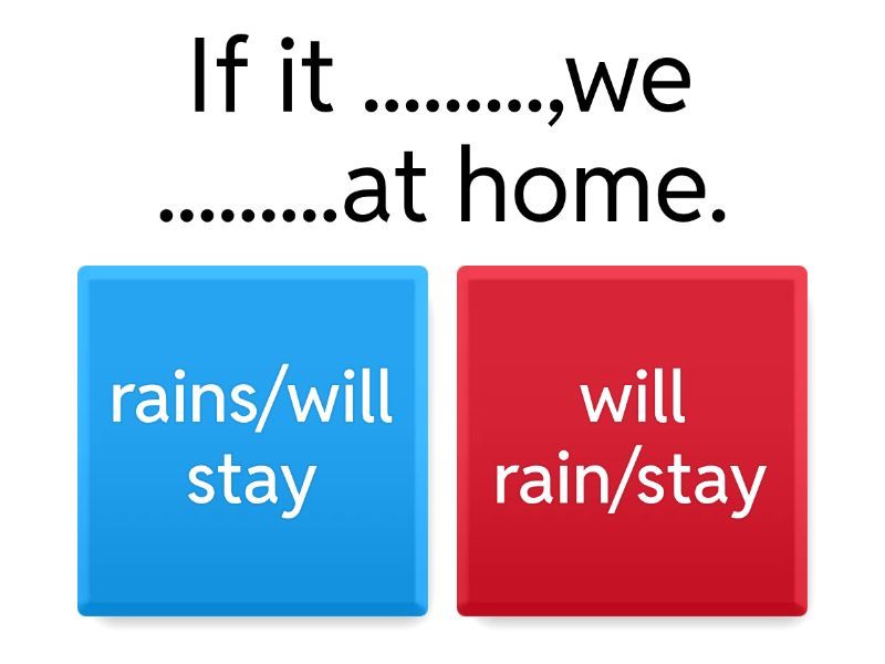 1) If it .........,we .........at home. a) rains/will stay b) will rain/stay 2) If I ...........Sara,I ..............her the news. a) see/will tell b) will see/tell 3) If they .................,they .....................catch the bus. a) hurry/will b) will hurry/catch 4) If you study, you .................... get good marks. a) would b) will 5) If my friend ............ me to the cinema,I..............with her. a) invites/go b) invites/will go 6) If it .........tomorrow,we will ................ a snowman. a) snows/build b) snow/build 7) If she .............eat too much chocolate,she ............. feel sick. a) eat/will feel b) eats/will feel 8) If you .............study hard,you ..............the test. a) study/will pass b) studied/ will pass