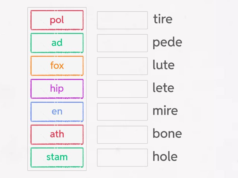 rep - tile, mat - tress, cas - cade, ad - mire, dis - like, stam - pede, ath - lete, com - plete, in - flate, en - tire, hip - bone, sup - pose, fox - hole, pol - lute,