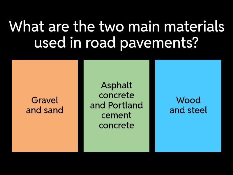 1) What are the two main materials used in road pavements? a) Gravel and sand b) Asphalt concrete and Portland cement concrete c) Wood and steel 2) Which pavement type is known for flexibility and quick repair? a) Rigid pavement b) Permeable pavement c) Flexible pavement 3) What is a common disadvantage of rigid pavement? a) Low durability b) Higher initial cost c) High noise level 4) What is "Chip Seal"? a) A concrete slab reinforcement method b) A layer of aggregate over asphalt emulsion for low-traffic roads c) A type of permeable pavement 5) Which defect resembles alligator skin? a) Block cracking b) Alligator c racking c) Rutting 6) What test is used to assess pavement thickness and bearing capacity? a) Crack seal test b) Core test & deflection test c) Emulsion test 7) Which pavement type allows water to drain through to reduce flooding? a) Surface course b) Base and subbase c) Binder layer 8) What layer is crucial for load distribution and drainage? a) Surface course b) Base and subbase c) Binder layer 9) How long is the typical service life of rigid pavement? a) 10 years b) 20 years c) Approximately 40 years 10) Which pavement is preferred for heavy loads like those on motorways and ports? a) Flexible pavement b) Rigid pavement c) Chip seal