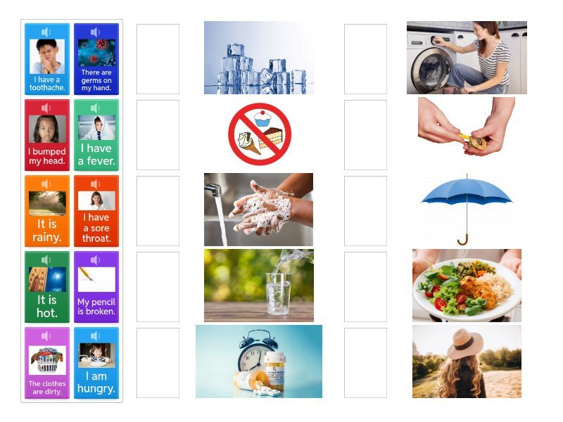 I have a sore throat., I am hungry., My pencil is broken., The clothes are dirty., It is rainy., I have a toothache., It is hot., There are germs on my hand., I have a fever., I bumped my head.,