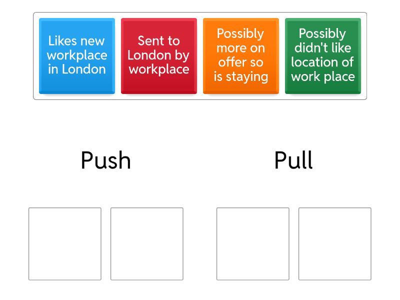 Push : Sent to London by workplace, Possibly didn't like location of work place, Pull: Likes new workplace in London, Possibly more on offer so is staying,