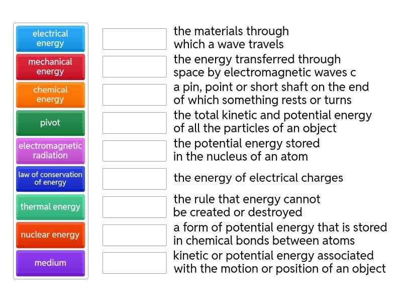 mechanical energy - kinetic or potential energy associated with the motion or position of an object, nuclear energy - the potential energy stored in the nucleus of an atom, thermal energy - the total kinetic and potential energy of all the particles of an object, chemical energy - a form of potential energy that is stored in chemical bonds between atoms, electrical energy - the energy of electrical charges, electromagnetic radiation - the energy transferred through space by electromagnetic waves c , medium - the materials through which a wave travels, law of conservation of energy - the rule that energy cannot be created or destroyed, pivot - a pin, point or short shaft on the end of which something rests or turns,