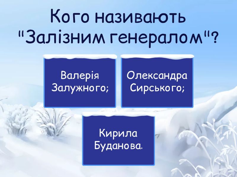 1) Кого називають "Залізним генералом"? a) Валерія Залужного; b) Олександра Сирського; c) Кирила Буданова. 2) Скільки прикордонників захищали острів Зміїний? a) 13; b) 7; c) 3. 3) Хто зробив фразу «Доброго вечора, ми з України!» популярною та відомою не тільки в Україні, а й у всьому світі? a) Володимир Зеленський; b) Віталій Кім; c) Сергій Притула. 4) Скільки героїв віднесено до «Небесної сотні»? a) 100; b) 107; c) 113. 5) Які три основні види військ входять до складу Збройних Сил України? a) Артилерія, Танкові війська, Піхота;  b) Національна гвардія, Прикордонна служба, Служба безпеки; c) Сухопутні війська, Повітряні Сили, Військово-Морські Сили. 6) Як називають військових, що захищають небо України? a) Артилеристи; b) ППО; c) Інженери. 7) В який день в Україні відзначається День Збройних Сил України? a) 24 серпня; b) 14 жовтня; c) 6 грудня. 8) Який елемент, що походить від символіки Запорізької Січі, є центральним на емблемі Збройних Сил України? a) Шабля; b) Козацький хрест; c) Тризуб. 9) Яке відоме вітання стало офіційним у Збройних Силах України? a) Слава Україні! Героям Слава! b) Честь маю! c) Доброго ранку!  10) Як називається військовий службовець (священник), який здійснює душпастирську опіку та релігійну підтримку військовослужбовців ЗСУ? a) Військовий психолог; b) Військовий прокурор; c) Військовий капелан.