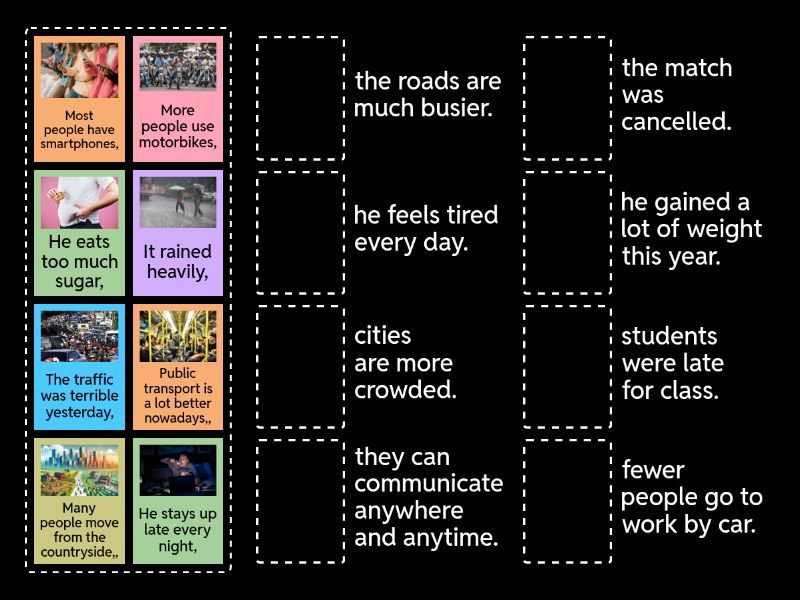 It rained heavily, - the match was cancelled., There was a storm last night, - many trees fell down., Most people have smartphones, - they can communicate anywhere and anytime., F actories use the newest machines, - production is faster and safer., Students use the internet for study, - they find information more easily., He saved money every month, - he could buy a car., Prices increased a lot this year, - people bought fewer luxuries., Many people move from the countryside,, - cities are more crowded., The traffic was terrible yesterday, - students were late for class., More people use motorbikes, - the roads are much busier., Public transport is a lot better nowadays,, - fewer people go to work by car., He stays up late every night, - he feels tired every day., People eat too much processed food, - they are unhealthier than before., He eats too much sugar, - he gained a lot of weight this year., He never exercises, - he feels tired and weak all the time.,