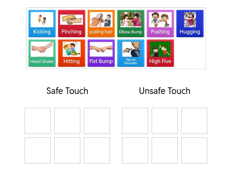Safe Touch: Hugging, High Five, Hand Shake, Fist Bump, Elbow Bump, Tap on Shoulder, Unsafe Touch: Hitting, Pinching, Pushing, Kicking, pulling hair,