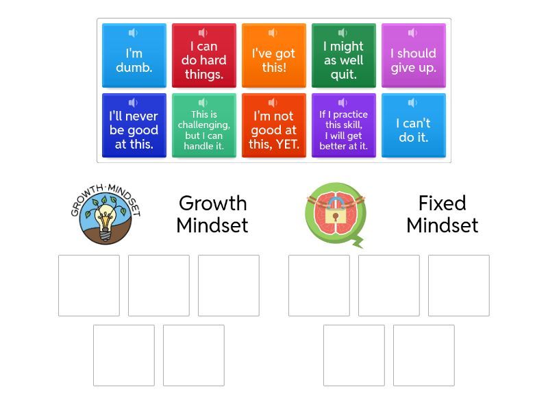 Growth Mindset: I can do hard things., If I practice this skill, I will get better at it., I'm not good at this, YET., I've got this!, This is challenging, but I can handle it., Fixed Mindset: I can't do it., I'm dumb., I'll never be good at this., I might as well quit., I should give up.,