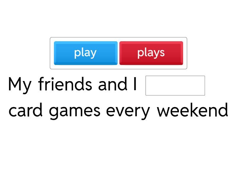 My friends and I ____ card games every weekend My friend Sarah ____ novels based on true events My brother and sister ____ German and French I ____ to the dentist once a month. My coworkers____ our new offices. My boss ____ in three different buildings. The dog ____ to the cats from the neighbourhood Maddox ____ in Brazil.He speaks Portuguese. Luca and Alessandro ____ pizza. They are Italian. Arthur ____ family in Australia.