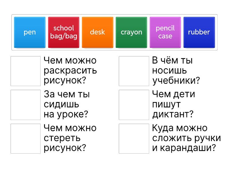 pen - Чем дети пишут диктант?, glue - Что нужно для аппликации?, chair - На чём сидит ученик?, crayon - Чем можно раскрасить рисунок?, rubber - Чем можно стереть рисунок?, sharpener - Чем можно точить карандаш?, pencil case - Куда можно сложить ручки и карандаши?, ruler - Что нужно, чтоб нарисовать ровную линию?, school bag/bag - В чём ты носишь учебники?, desk - За чем ты сидишь на уроке?, workbook - В чём можно порисовать?,
