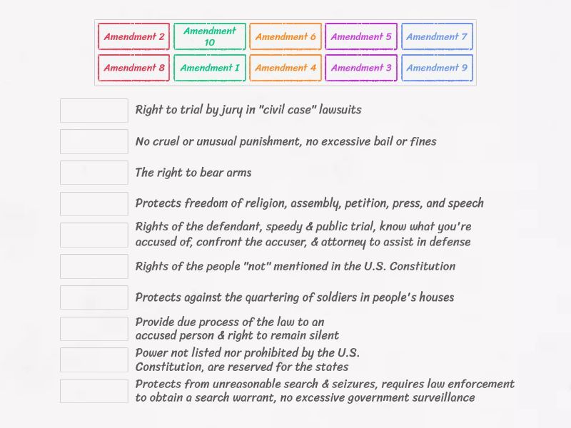 Amendment I - Protects freedom of religion, assembly, petition, press, and speech, Amendment 2 - The right to bear arms, Amendment 3 - Protects against the quartering of soldiers in people's houses, Amendment 4 - Protects from unreasonable search & seizures, requires law enforcement to obtain a search warrant, no excessive government surveillance, Amendment 5 - Provide due process of the law to an accused person & right to remain silent, Amendment 6 - Rights of the defendant, speedy & public trial, know what you're accused of, confront the accuser, & attorney to assist in defense , Amendment 7 - Right to trial by jury in "civil case" lawsuits, Amendment 8 - No cruel or unusual punishment, no excessive bail or fines, Amendment 9 - Rights of the people "not" mentioned in the U.S. Constitution , Amendment 10 - Power not listed nor prohibited by the U.S. Constitution, are reserved for the states,