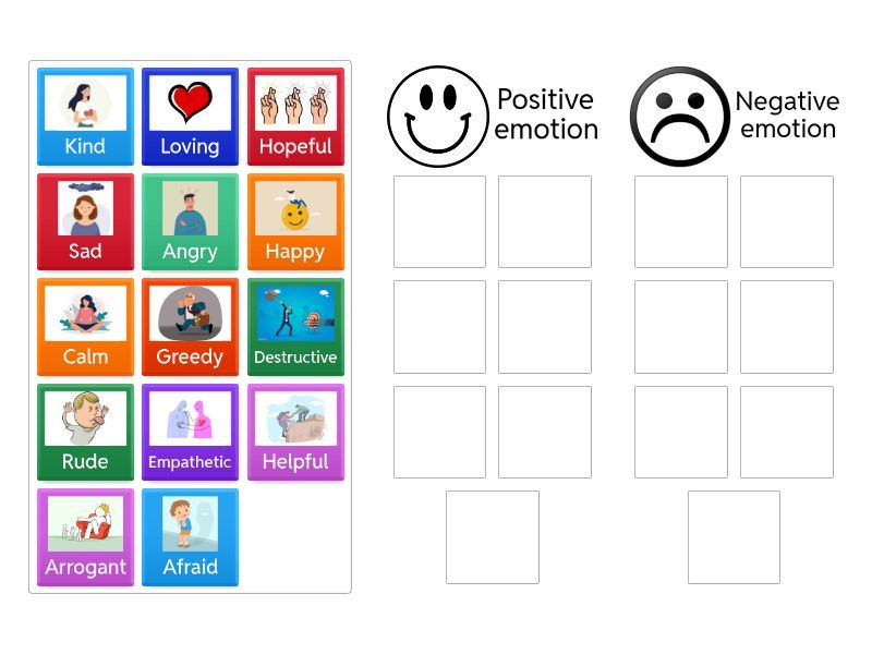 Positive emotion: Happy, Hopeful, Loving, Empathetic, Calm, Kind, Helpful, Negative emotion: Sad, Afraid, Greedy, Arrogant, Angry, Rude, Destructive,