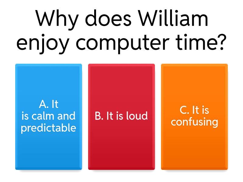 1) Why does William enjoy computer time? a) A. It is calm and predictable b) B. It is loud c) C. It is confusing 2) What helps William stay focused? a) A. Clear directions b) B. Loud music c) C. Surprises 3) Why does he like working near classmates? a) He wants to copy b) He gets distracted c) It feels safe and connected 4) What can we infer about William’s learning style? a) He likes structure b) B. He likes chaos c) C. He dislikes computers 5) Why does he enjoy Lexia? a) It has no instructions b) He can work independently c) It is noisy 6) What do you think William likes about Kahoot? a) It never changes b) It is fun and interactive c) It is boring 7) How does William handle noise in the classroom? a) A. Slow breathing and focus b) B. Yelling c) C. Leaving the room 8) Why is routine important to William? a) It helps him feel calm b) It confuses him c) He dislikes knowing what’s next 9) What does completing a level make him feel? a) Sad b) Tired c) Proud 10) Why are computers meaningful to William? a) They take away time with friends b) They help him feel successful and safe c) They make school harder