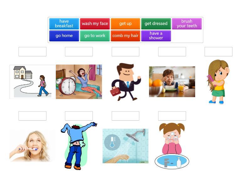 comb my hair, go to work, get dressed, brush your teeth, have breakfast, get up , wash my face , go home, have a shower,
