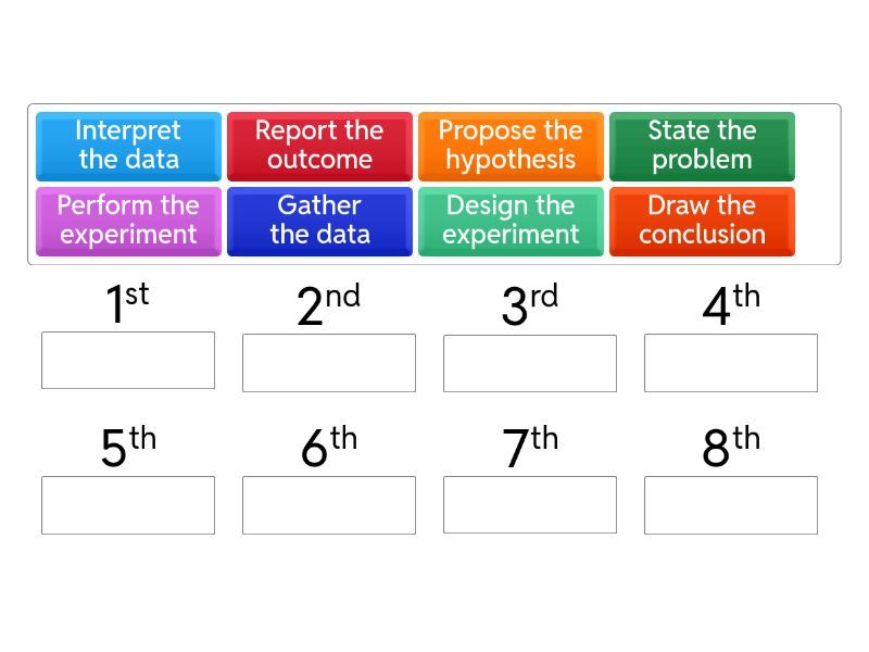 State the problem, Propose the hypothesis, Design the experiment, Perform the experiment, Gather the data, Interpret the data, Draw the conclusion, Report the outcome.