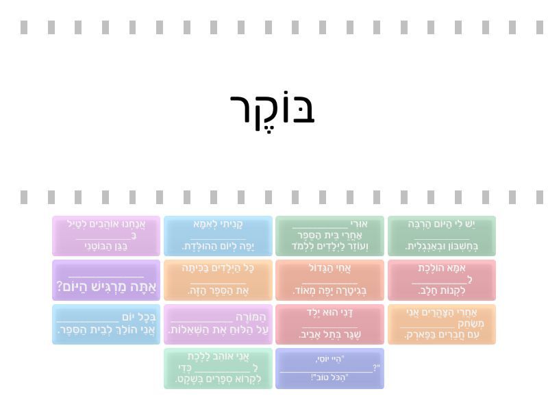 בְּכָל יוֹם ___________ אֲנִי הוֹלֵךְ לְבֵית הַסֵּפֶר. - בּוֹקֶר, דָּנִי הוּא יֶלֶד ___________ שֶׁגָּר בְּתֵל אָבִיב. - יִשְׂרְאֵלִי, אַחֲרֵי הַצָּהֳרַיִם אֲנִי מְשַׂחֵק ___________ עִם חֲבֵרִים בַּפָּארְק. - כַּדּוּרֶגֶל, יֵשׁ לִי הַיּוֹם הַרְבֵּה ___________ בְּחֶשְׁבּוֹן וּבְאַנְגְלִית. - שִׁיעוּרֵי בַּיִת, הַמּוֹרֶה ___________ עַל הַלּוּחַ אֶת הַשְּׁאֵלוֹת. - כּוֹתֵב, "הַיי יוֹסִי, ______________________?" "הַכֹּל טוֹב!" - מָה הָעִנְיָנִים?, אֲנִי אוֹהֵב לָלֶכֶת לַ ___________ כְּדֵי לִקְרוֹא סְפָרִים בְּשֶׁקֶט. - סִפְרִיָּה, אֲחִי הַגָּדוֹל ___________ בְּגִיטָרָה יָפֶה מְאוֹד. - מְנַגֵּן, ___________ אַתָּה מַרְגִּישׁ הַיּוֹם? - אֵיךְ, קָנִיתִי לְאִמָּא ___________ יָפָה לְיוֹם הַהוּלֶּדֶת. - מַתָּנָה, אִמָּא הוֹלֶכֶת לַ___________ לִקְנוֹת חָלָב. - חֲנוּת, כָּל הַיְּלָדִים בַּכִּיתָּה ___________ אֶת הַסֵּפֶר הַזֶּה. - קוֹרְאִים, אוּרִי ___________ אַחֲרֵי בֵּית הַסֵּפֶר וְעוֹזֵר לַיְּלָדִים לִלְמֹד - מִתְנַדֵּב, אֲנַחְנוּ אוֹהֲבִים לְטַיֵּל בַּ___________ בַּגַּן הַבּוֹטָנִי - טֶבַע,