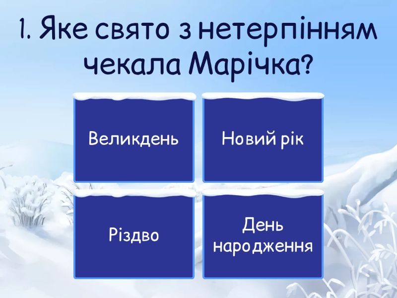 1) 1. Яке свято з нетерпінням чекала Марічка? a) Великдень b) Новий рік c) Різдво d) День народження 2) 2. Звідки мала приїхати тітка Марічки? a) З Києва b) З Дніпра c) З Харкова d) З Полтави 3) 3. Що Марічка хотіла купити за колядки? a) Нові черевики b) Рожеву «вдяганку» для телефона і обруч c) Ляльку d) Рюкзак 4) 4. Куди дітей повезла Марія Павлівна? a) У ліс b) У санаторій c) У музей d) У театр 5) 5. Хто жив у санаторії? a) Туристи b) Студенти c) Діти зі Сходу, де йде війна d) Іноземці 6) 6. Як звали вчительку? a) Ганна Петрівна b) Олена Василівна c) Марія Павлівна d) Наталія Іванівна 7) 7. Як звали дівчинку, з якою першою познайомилася Марічка? a) Оля b) Оксанка c) Марина d) Катруся 8) 8. Звідки була Оксанка? a) З Києва b) З Львова c) З Луганська d) З Одеси 9) 9. Хто був разом з Оксанкою в санаторії? a) Мама b) Молодший брат c) Двоюрідна сестра d) Старша сестричка 10) 10. Чому по щоці Оксанки потекла сльоза? a) Вона образилась b) Згадала бабусю c) Хтось її зачепив d) Не хотіла говорити 11) 11. Що діти робили після знайомства? a) Різали дрова b) Малювали, гралися, жартували c) Спали d) Працювали в класі 12) 12. До кого першою побігла Марічка збирати гроші? a) До сусідки b) До мами c) До хрещеної d) До директора 13) 13. Для чого Марічці потрібні були гроші? a) Купити подарунки собі b) Купити бабусі Оксанки квиток c) Купити іграшку d) Замовити торт 14) 14. Кому ще Марічка навідалася по гроші? a) До тата і мами b) До бібліотекарки c) До бабусі Зіни, дядька Василя та хрещеного d) До сусідів по вулиці 15) 15. Скільки грошей, як вважала Марічка, потрібно на квиток? a) 200 грн b) 300 грн c) 500 грн d) 1000 грн 16) 16. Кого Марічка зустріла, коли поверталася зі школи? a) Подругу b) Маму c) Вчительку d) Тітку 17) 17. Що зробили батьки, дізнавшись історію Марічки? a) Посварили її b) Запропонували почекати до Різдва c) Віддали їй свою «колядку» d) Відмовили допомагати 18) 18. Який настрій був у Марічки перед сном? a) Сумний b) Злий c) Стурбований d) Щасливий 19) 19. Про що думала Марічка перед сном? a) Про власні покупки b) Про шкільні уроки c) Про радість Оксанки й сестрички, коли приїде бабуся d) Про колядування 20) 20. Що стало головним для Марічки наприкінці оповідання? a) Подарунки для себе b) Новий телефон c) Допомога іншим та щастя друзів d) Гарні оцінки