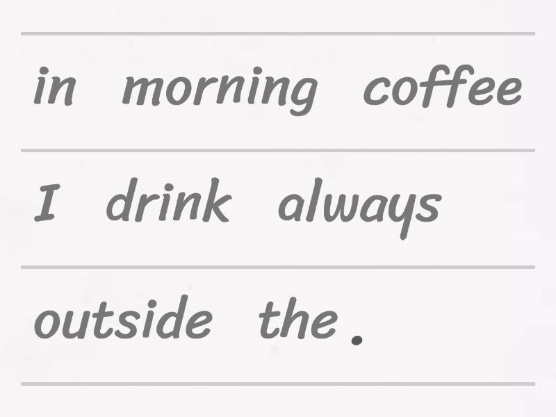 I always drink coffee outside in the morning., He often goes to the cinema at the weekend., She sometimes listens to music on her way to school in the afternoon., We never go to the cinema on weekdays., They rarely have English lessons online on Mondays and Thursdays., I don't usually take a bath in the morning., He doesn't usually brush teeth in the afternoon., She doesn't often call her friends late at night., We don't often do morning exercises on Sunday mornings., They don't often do homework in the school cafe from 3 to 5.,