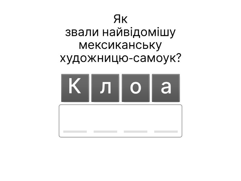 Кало - Як звали найвідомішу мексиканську художницю-самоук?, Інки - Яка цивілізація створила Мачу-Пікчу?, Амазонка - Найбільша річка Латинської Америки., Бразилія - У якій країні відбувається найвідоміший карнавал світу?, Танго - Який стиль танцю виник в Аргентині?, Кечуа - Яка мова інків (офіційна в Перу)?, Майя - Стародавня цивілізація, що будувала піраміди майя., Рівера - Мексиканський художник-муралінст, чоловік Фріди Кало., Румба - Музичний стиль з Куби, що дав ритм сальсі., Фріда - Художниця, що часто малювала автопортрети та використовувала національні мотиви., муралізм - Мексиканське мистецтво стінописів називається…, Спмпонія - Найзнаменитіший перуанський народний музичний інструмент,