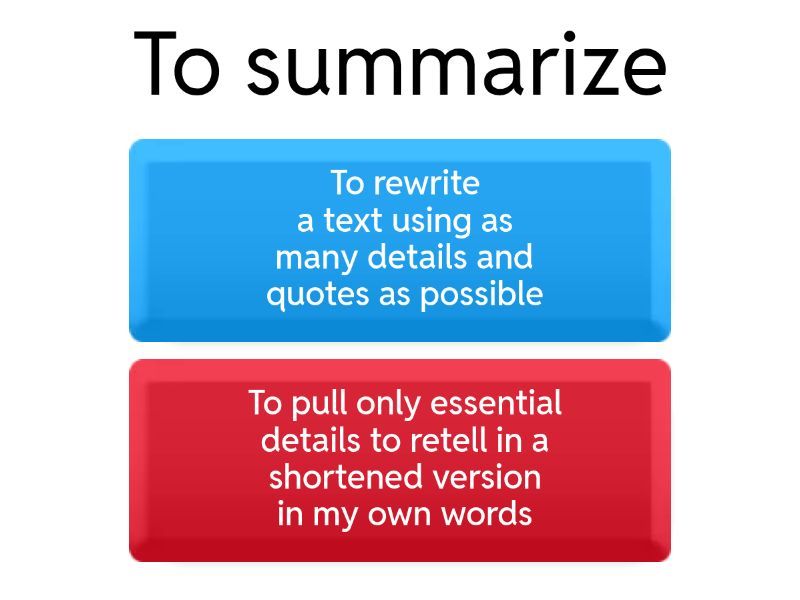 1) To summarize a) To rewrite a text using as many details and quotes as possible b) To pull only essential details to retell in a shortened version in my own words 2) True or False? I should never use sequencing words when summarizing a text, story or video a) True b) False 3) True or False? A summary should be just a long or longer than the original text. a) True b) False 4) True or False? Summarizing helps to better comprehend the important parts of a text or video. a) True b) False 5) Essential details means... a) every little detail in a story b) The most important or needed details of a story 6) True or False? I should always include evidence and quotes in a summary. a) True b) False 7) Most summaries are between 3-5 paragraphs. a) True b) False 8) A summary should always be in my own words. a) True b) False 9) Using sequencing words is a good way to keep the events in a summary in the correct order. a) True b) False 10) Most summaries are between 3-5 sentences, depending on the length of the original text or video a) True b) False