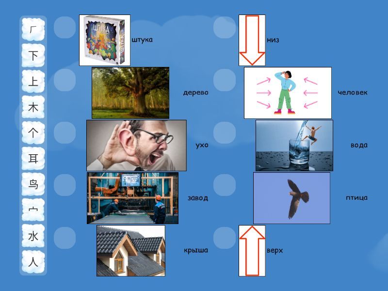工 - работа, 土 - почва, 人 - человек, 个 - штука, 大 - большой, 𠂆 - завод, 天 - день, небо, 木 - дерево , 本 - корень, 乍 - внезапный, 上 - верх, 下 - низ, 小 - маленький, 宀 - крыша, 王 - князь, 文 - письмена, 牛 - корова, 耳 - ухо, 心 - сердце, 元 - юань, 毛 - шерсть, 山 - гора, 女 - женщина, 又 - снова, 水 - вода, 车 - повозка, 马 - лошадь, 鸟 - птица, 刀 - нож, 力 - сила,