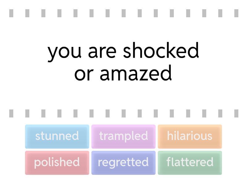 stunned - you are shocked or amazed, polished - when a performance is given with great skill and no mistakes, hilarious - very funny, flattered - when something made you feel honored or special, trampled - something gets stepped on and damaged or crushed, regretted - you felt sorry about something and wish you hadn't done it,